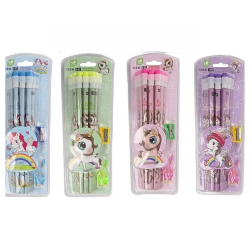 Unicorn Stationery Set | 12 HB Pencils, Sharpener, Eraser & Pencil Cap